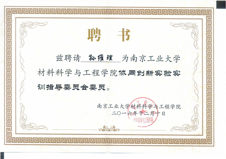 孫維理董事長榮獲南京工業(yè)大學(xué)材料科學(xué)與工程學(xué)院授予的“協(xié)同創(chuàng)新實驗實訓(xùn)指導(dǎo)委員會委員”。