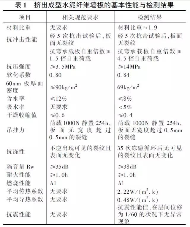 由福泰高科環(huán)??萍?上海)有限公司提供的復合墻板相關(guān)檢測報告表明,擠出成型水泥纖維墻板完全滿足鋼結(jié)構(gòu)住宅對維護墻板高強、輕質(zhì)、具有良好的保溫隔熱、隔聲、防水、防火、抗裂和耐候等綜合性能的要求,表1為擠出成型水泥纖維墻板的基本性能與檢測結(jié)果與《建筑隔墻用輕質(zhì)條板》JGJ/T169-2005、《建筑用輕質(zhì)隔墻條板》GB/T23451-2009、《建筑材料及制品燃燒性能分級》GB86242006等相關(guān)規(guī)范要求指標對比結(jié)果。